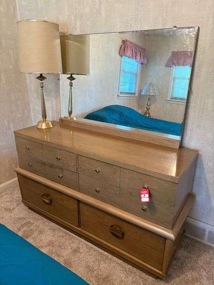 includes: 58"W dresser with mirror, 40"W chest of drawers & queen size bed with mattress & linens, head board and rails located in basement (see last photo), note: buyer to remove & load, lamps not included