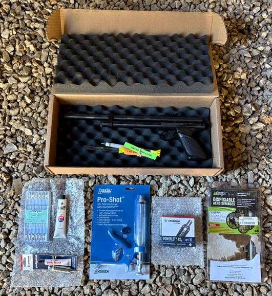 model: 1300C, new in box, includes: Cap-Chur disposable aero syringes, JorVet hypodermic needles, Crosman Powerlet CO2 cartridges, Pro-Shot 50cc pistol-grip syringe, lubricants, & manual